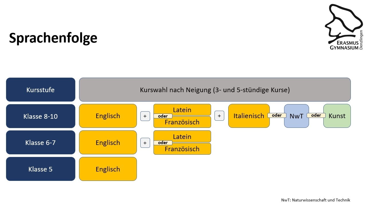 In der 5. Klasse beginnen alle Schülerinnen und Schüler mit Englisch als Kernfach. Als zweite Fremdsprache kommt entweder Französisch oder Latein in Klasse 6 hinzu.